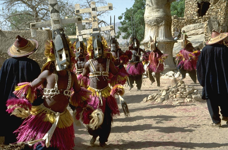 Dogon-Tänzer mit Kanaga- und Antilopen-Masken