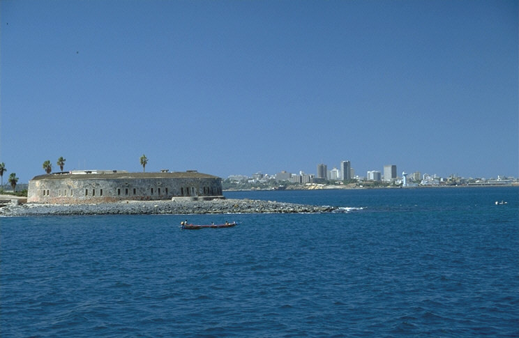 Hafenbastion auf Gorée mit Skyline von Dakar